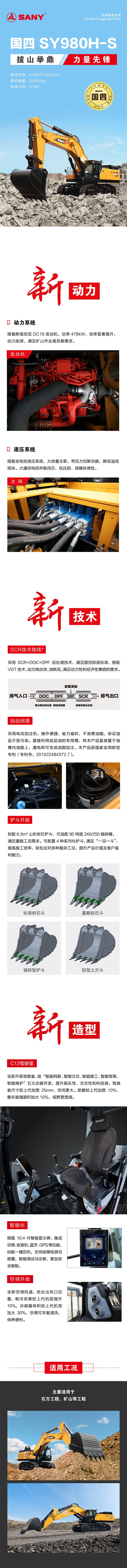 | 性能 | 行走速度:4.3/3.0km/h 爬坡能力:35° 回转速度:7rpm 接地比压:132kPa 铲斗挖掘力:495kN 斗杆挖掘力:405kN |